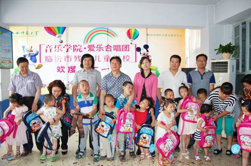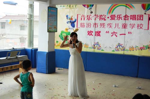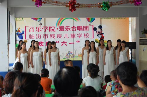 党员干部带领爱乐合唱团部分成员于2014年5月31日前往临汾市残疾儿童学校,专程为学校的孩子们送去了精彩的文艺节目和文具用品,与残疾学校的孩子们共同度过了快乐的儿童节。