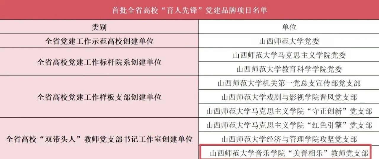 717日,山西省委教育工委公布首批全省高校育人先锋党建品牌项目,我校9个党建项目入选。其中,走光视频 美善相乐教师党支部入选全省高校双带头人教师党支部书记工作室创建单位。