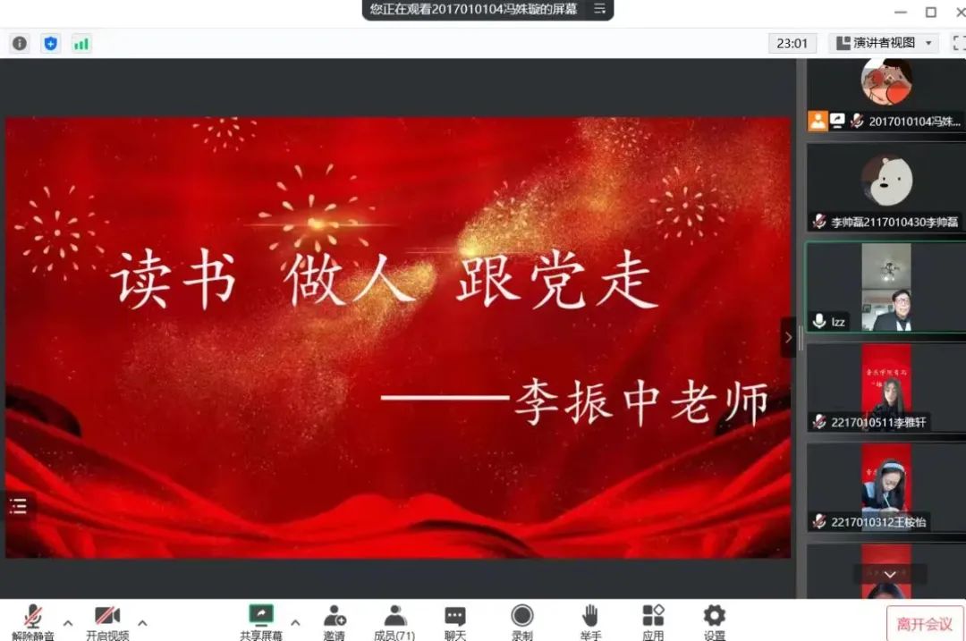 团委于11月17日组织青马学员开展线上青年马克思主义者培养活动。原副校长、现关工委副主任李振中老师以“读书 做人 跟党走”为主题向我院全体青马学员举办专题讲座。