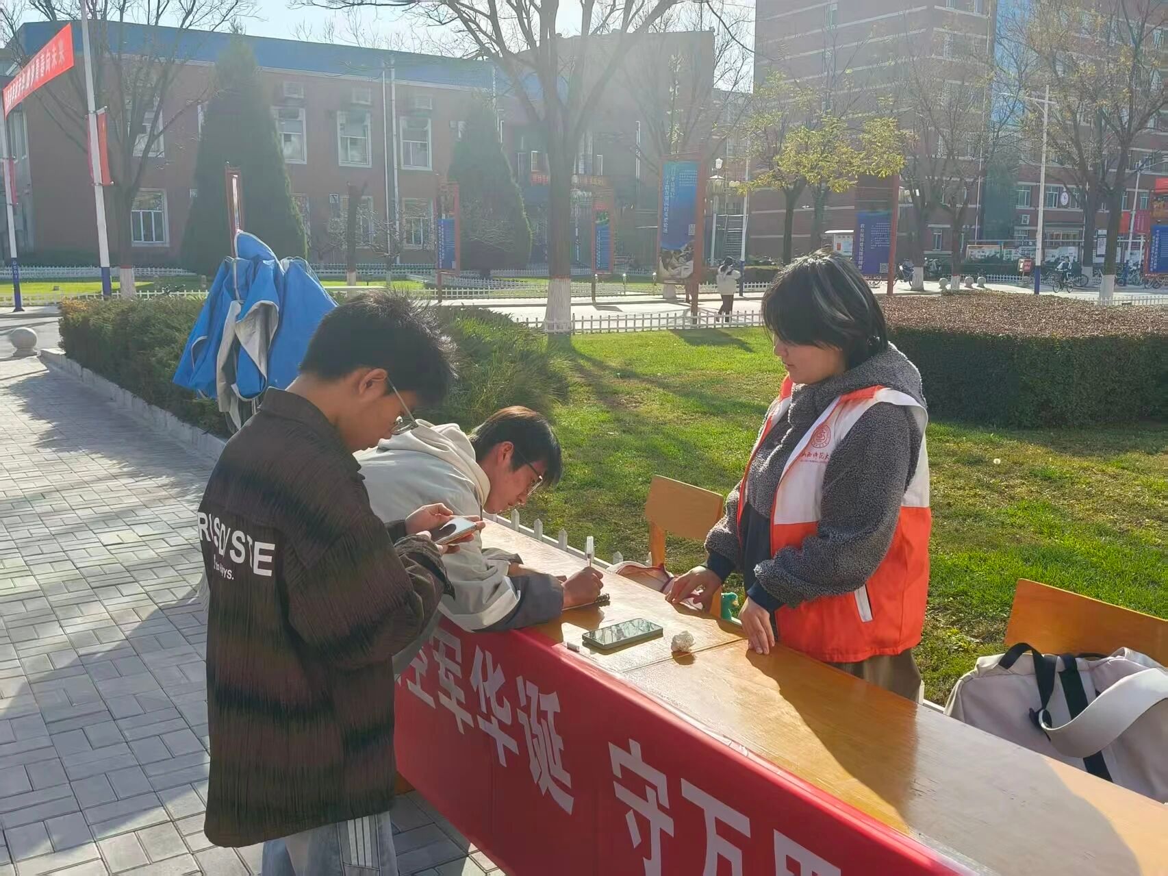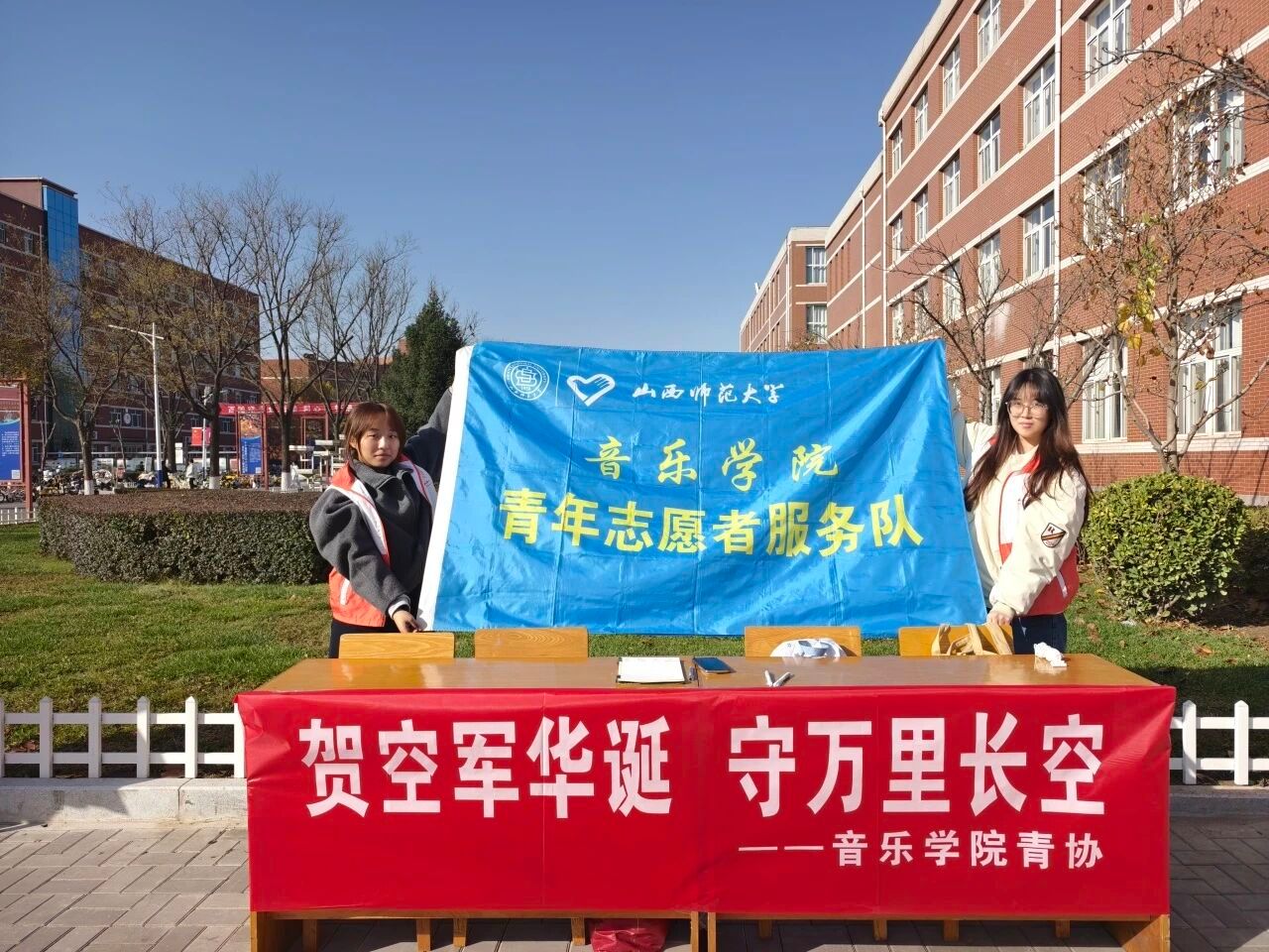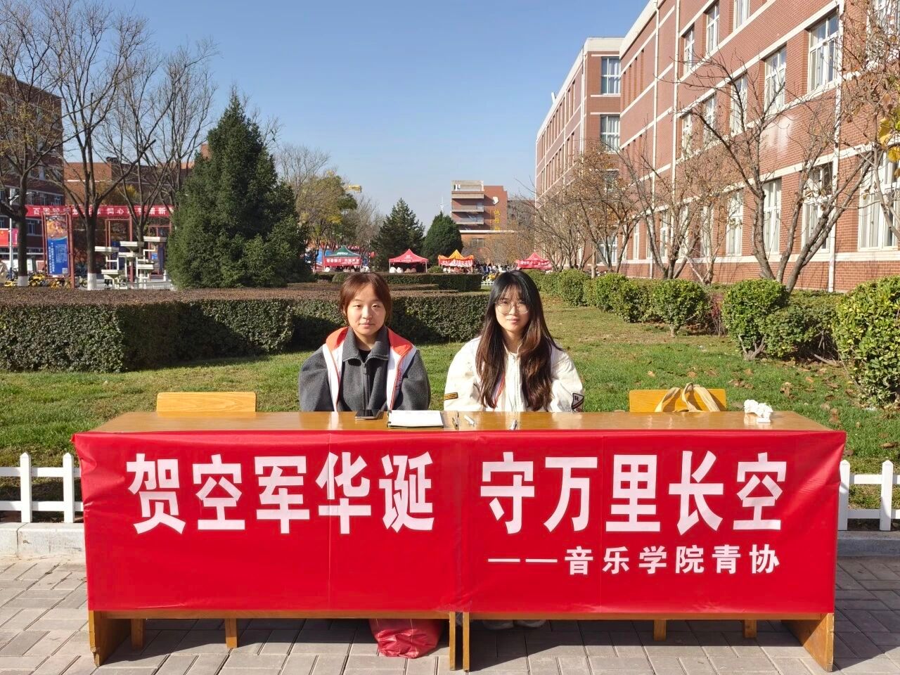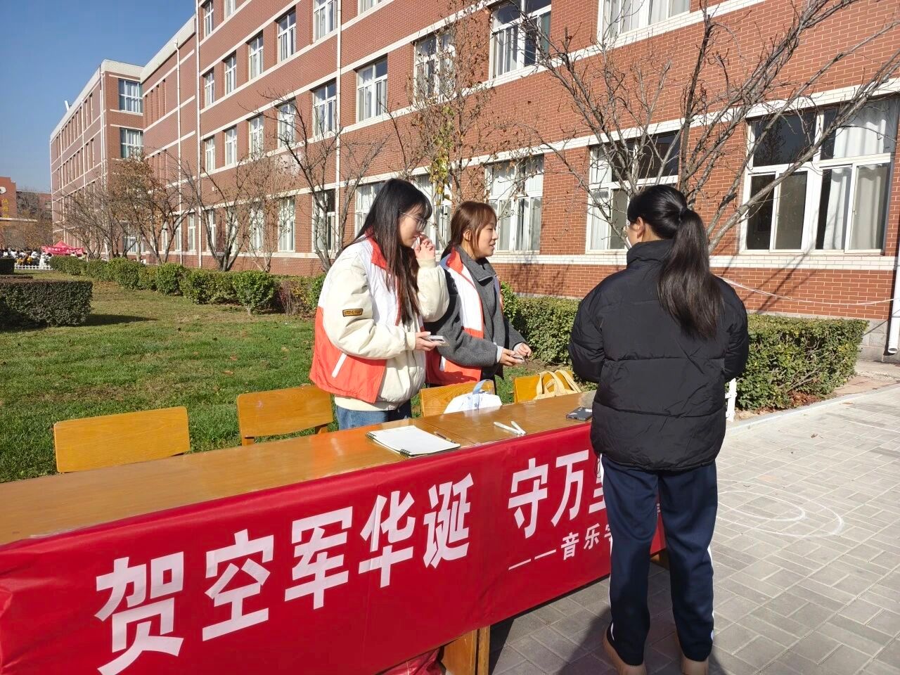青年志愿者们在三号教学楼与四号教学楼之间开展了“贺空军华诞,守万里长空”空军建军节主题活动。