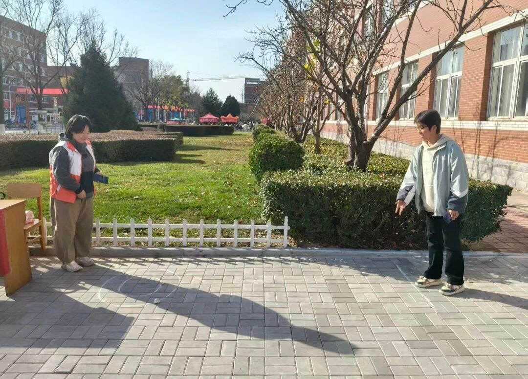活动现场设置两大趣味互动环节:“投‘弹’入筐”环节中,同学们以乒乓球、纸团为“炸弹”,在1.5米外瞄准粉笔圈“目标筐”投掷,趣味形式让大家在游戏中体会空军作战的精准意识;“口令反应”环节里,工作人员喊出“稍息”“立正”等军事口令,同学们快速回应,连续通关者在紧张反应中感受军人的纪律性。两大环节吸引众多学生参与,现场氛围热烈,笑声与口号声交织回荡。
