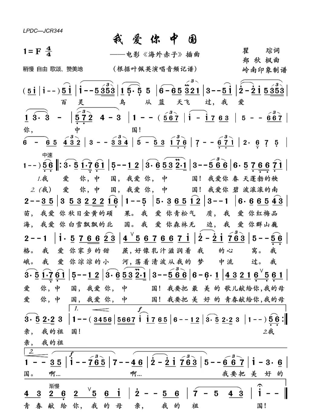 我爱你中国《我爱你中国》是电影《海外赤子》的插曲,由郑秋枫作曲、瞿琮作词。2012年歌手平安在歌唱类节目《中国好声音》导师盲选时所演唱,由于平安采用了轻摇滚的演唱风格,歌声清越激昂,台风大气,而为广大群众所熟知。2012年底,平安参加中央电视台《直通春晚》比赛并荣获年度总冠军,并于2013年蛇年春晚舞台献唱《我爱你中国》。2015年1月,在全球最大的视频社交网站YouTuBe上,平安演唱《我爱你中国》的视频已创下了超过千万的点击量,成为该网站史上被最多外国人听到的中文歌曲。