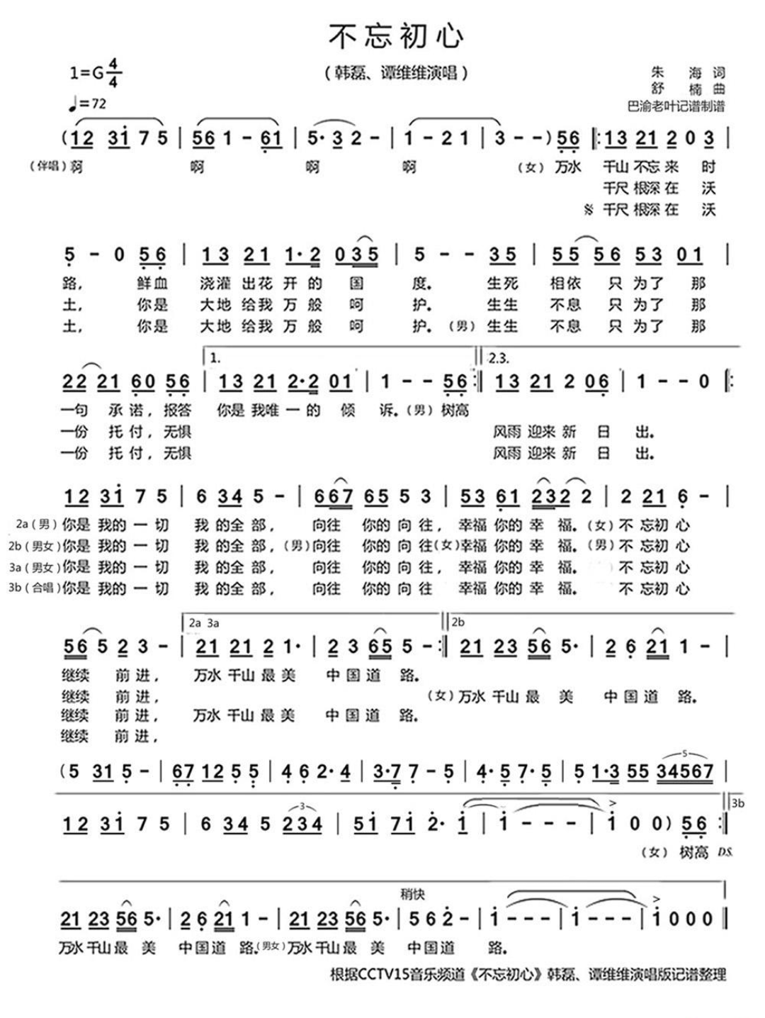 不忘初心》是由朱海作词,舒楠作曲,韩磊与谭维维演唱的一首歌曲。该曲于2016年10月19日在“永远的长征--纪念红军长征胜利80周年文艺晚会"上首唱,是2017年央视春晚零点压轴曲目,也是政论专题片《不忘初心继续前进》当中的主题曲,后收录于韩磊2017年3月发行的专辑《不忘初心·孝行天下》中,单曲于2019年9月28日发行。