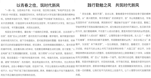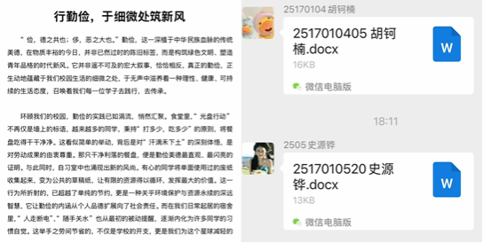 活动中,从前期宣传动员、班级征文征集,到后期作品筛选、优秀篇目评审,各环节有序推进。同学们以文字为桥梁,打破“勤俭”的抽象概念,用真实故事让勤俭可感可学;同时通过展示优秀作品,既提供可复制的勤俭行动范例,引导更多人从“知道”走向“做到”;又能汇聚个体声音形成社会共识,让“以俭为荣”的风尚在交流中传递,最终助力中华传统美德的传承与节约型社会的建设。