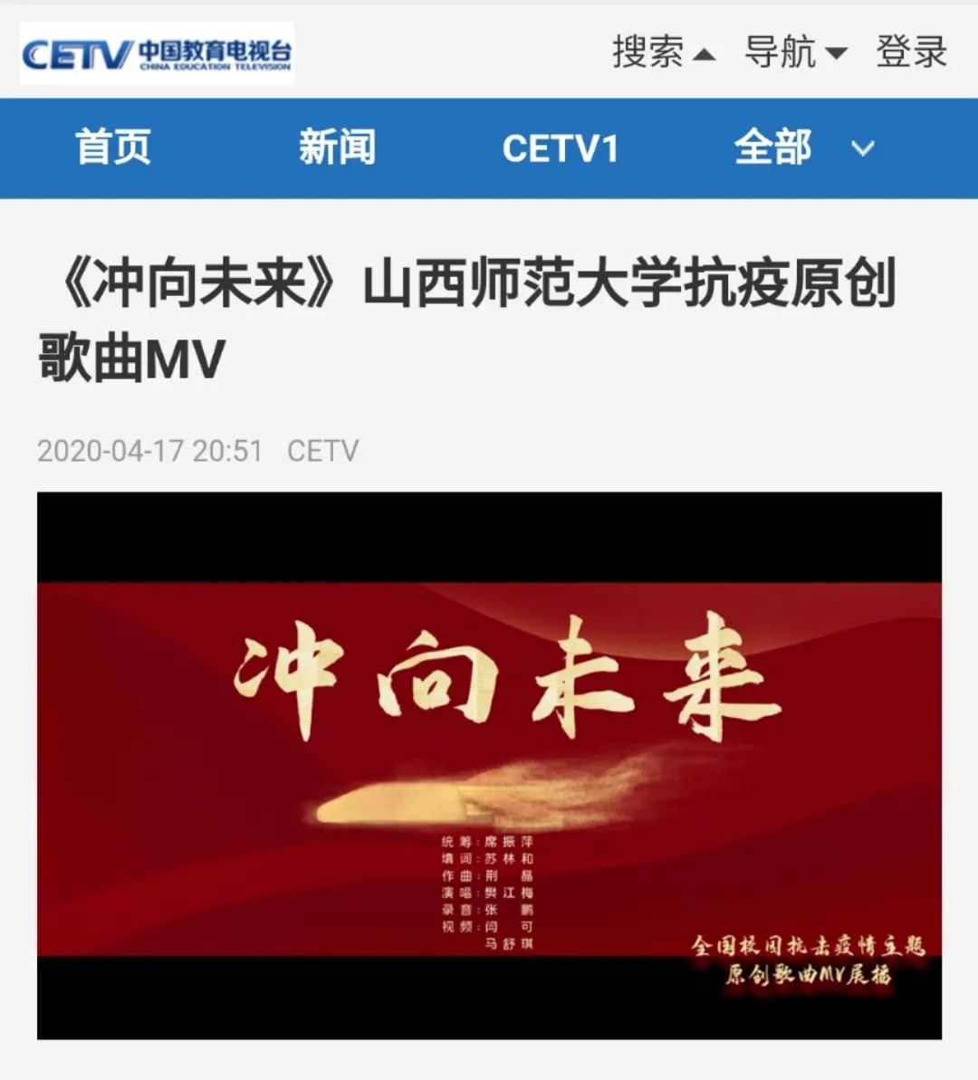 近日,走光视频 原创MV《冲向未来》被中国教育电视台在全国校园抗击疫情主题原创歌曲MV中展播。