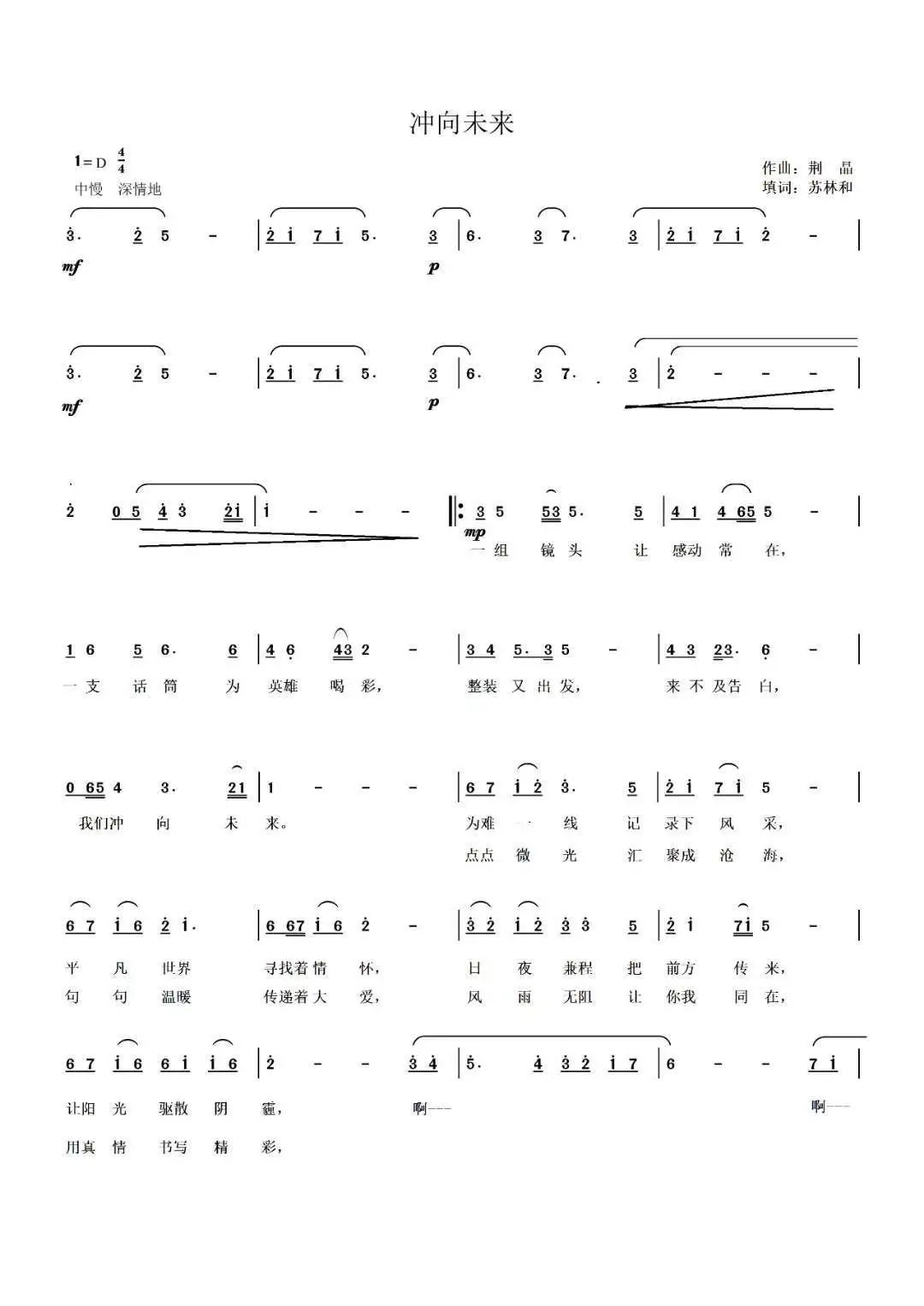 作品简介:《冲向未来》是由走光视频 同山西省戏剧研究所、晋城市文化与旅游局等多家单位联合创作的一首献给战“疫”记者的公益歌曲。该歌曲通过歌颂不畏艰险、深入疫区一线的媒体“逆行者”,向坚持在疫情一线为全世界带来真实和及时疫情报道的记者们表达了最崇高的敬意与祝福。歌曲由苏林和填词,荆晶作曲,樊江梅演唱,闫可、马舒琪制作MV。