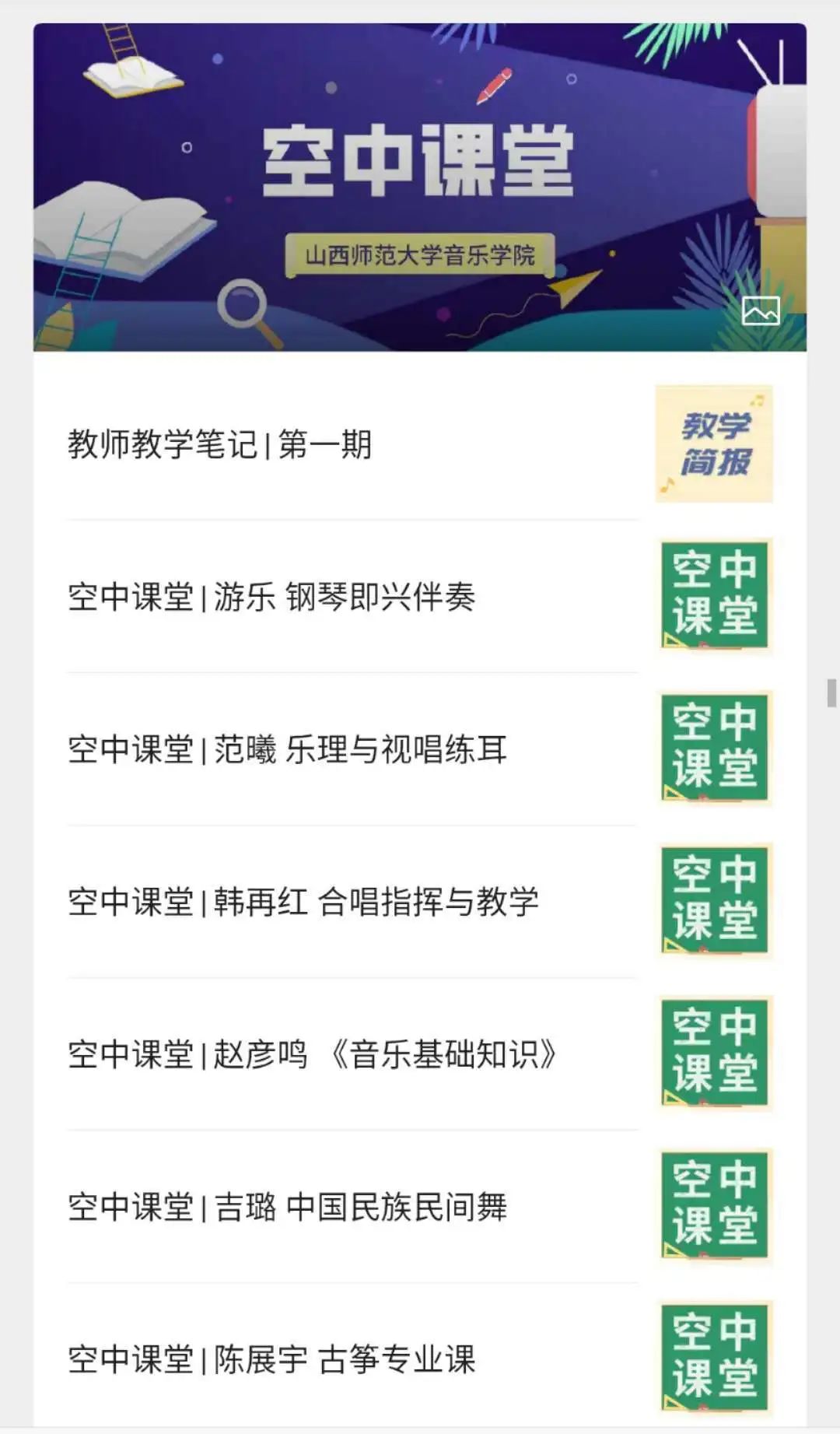 为了保证疫情防控期间的正常教学,确保学校人才培养工作不受疫情影响,我院教师根据学校和学院在疫情防控期间网络教学安排,按照“教师不停教、学生不停学、教学不断线”的原则,确保在线学习与线下课堂教学质量实质等效,通过线上直播、录播授课和线上学习等多种方式开展线上教学。我院微信公众号开展“空中课堂”特别栏目,记录、分享音院教师教学笔记及心得。见字如面,希望这些文字可以拉近师生间的距离,促进线上教学。