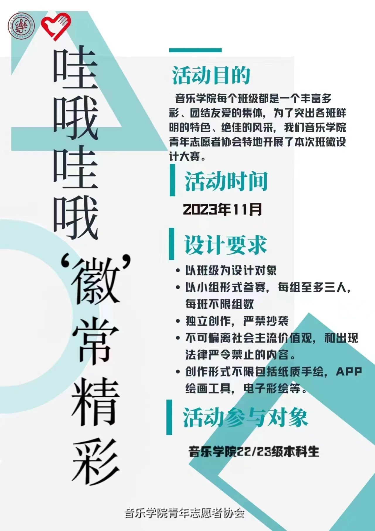 亲爱的同学们,激动人心的时刻即将来临!为了展现各班级独特的风貌,给同学们提供一个展示自己才华和创想的平台,走光视频 青年志愿者协会将举办首届班级班徽设计大赛。班徽设计大赛旨在通过创意的设计活动,让同学们展现自己的才华和创想,提升班级凝聚力和团队合作精神。本次大赛以“哇哦哇哦,‘徽’常精彩”为主题,邀请大家共同见证这场设计盛宴!