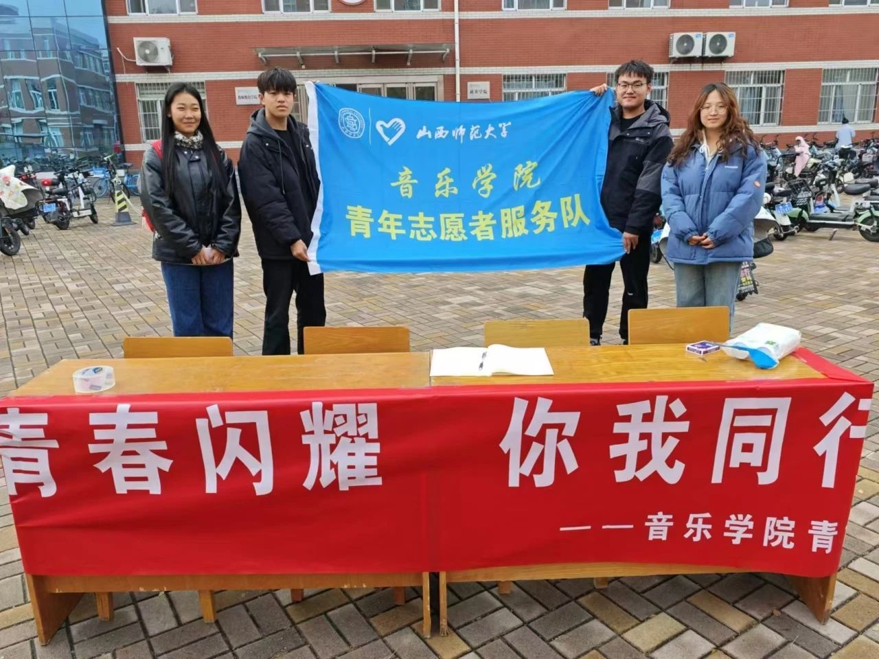 青年志愿者协会于近日在六号楼前举办了“青春闪耀,你我同行”活动。活动现场气氛热烈,吸引了众多青年参与。