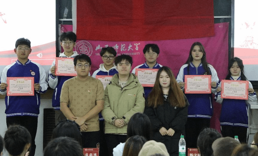 学生团委副书记畅文瑜、学生会执行主席张萌博、青协主席团成员陈亚蕾为获得团体一、二、三等奖的小组颁发奖状并合影留念。专职辅导员苏睿老师为优秀青马标兵颁发奖状并合影留念。