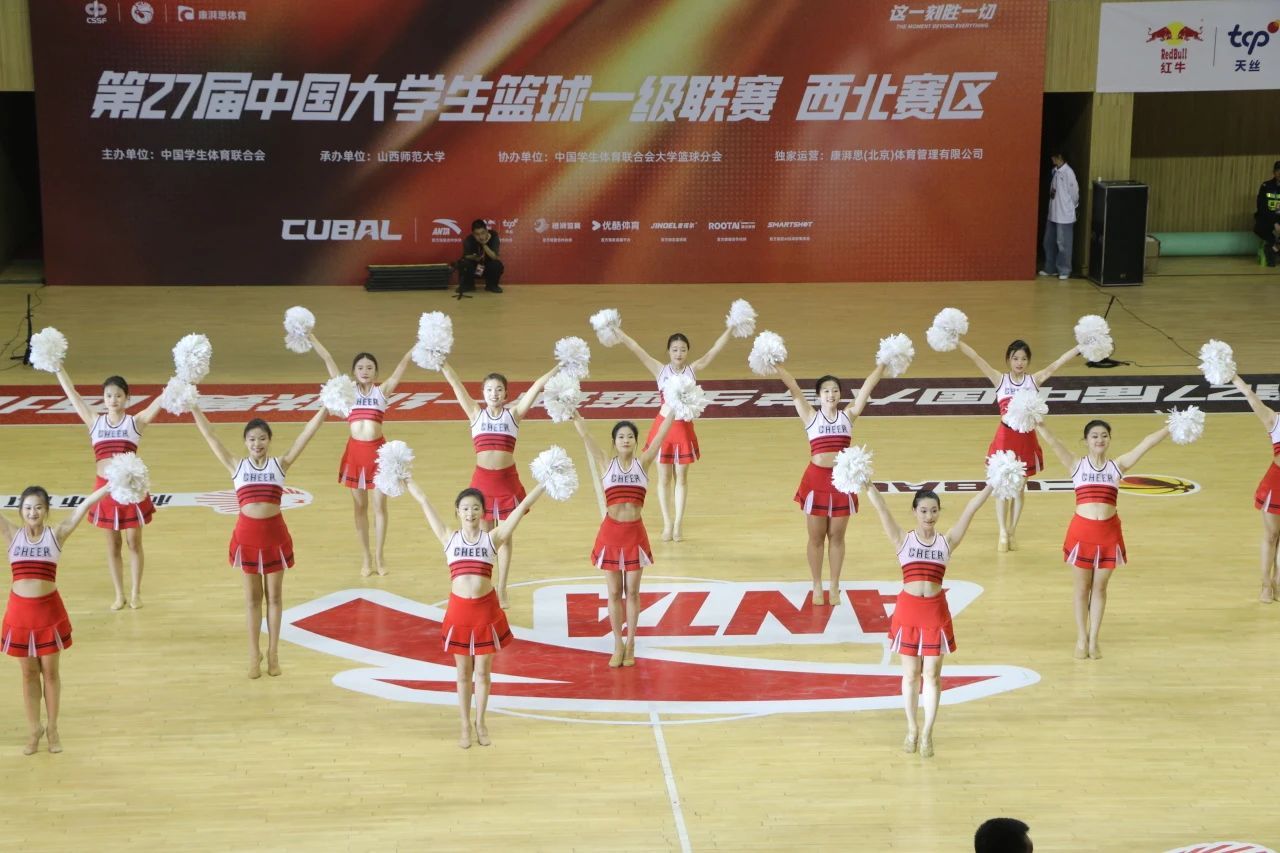 啦啦操队队员身着红白相间队服,以高难度托举、腾空翻转等动作,伴随音乐节奏,将现场气氛推向高潮,现场的同学们也一同为我校篮球队加油呐喊!