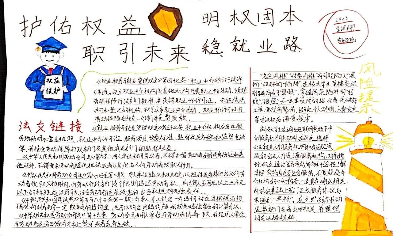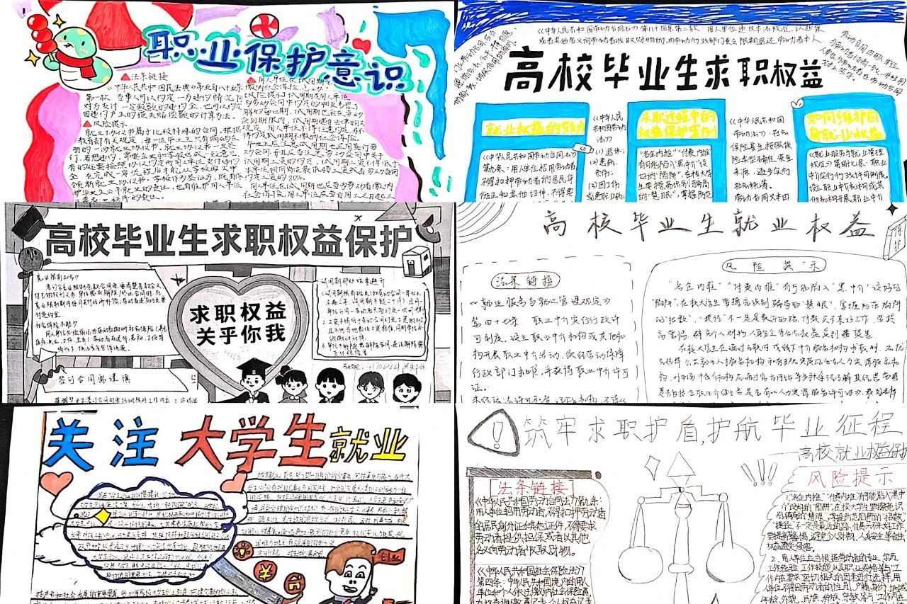 学生会权益部面向非毕业生举办了“权益护航·法治同行”主题活动,以征集“就业权益保护”主题手抄报的形式,吸引了众多同学参与。同学们充分发挥自身创意与艺术特长,在手抄报上用鲜艳色彩、精美插画和清晰文字,生动呈现就业权益保护要点,内容涵盖劳动合同签订注意事项、职场侵权应对方法、劳动法律法规知识等,同学们在手抄报创作过程中,也对就业权益保护知识有了更深入的了解。