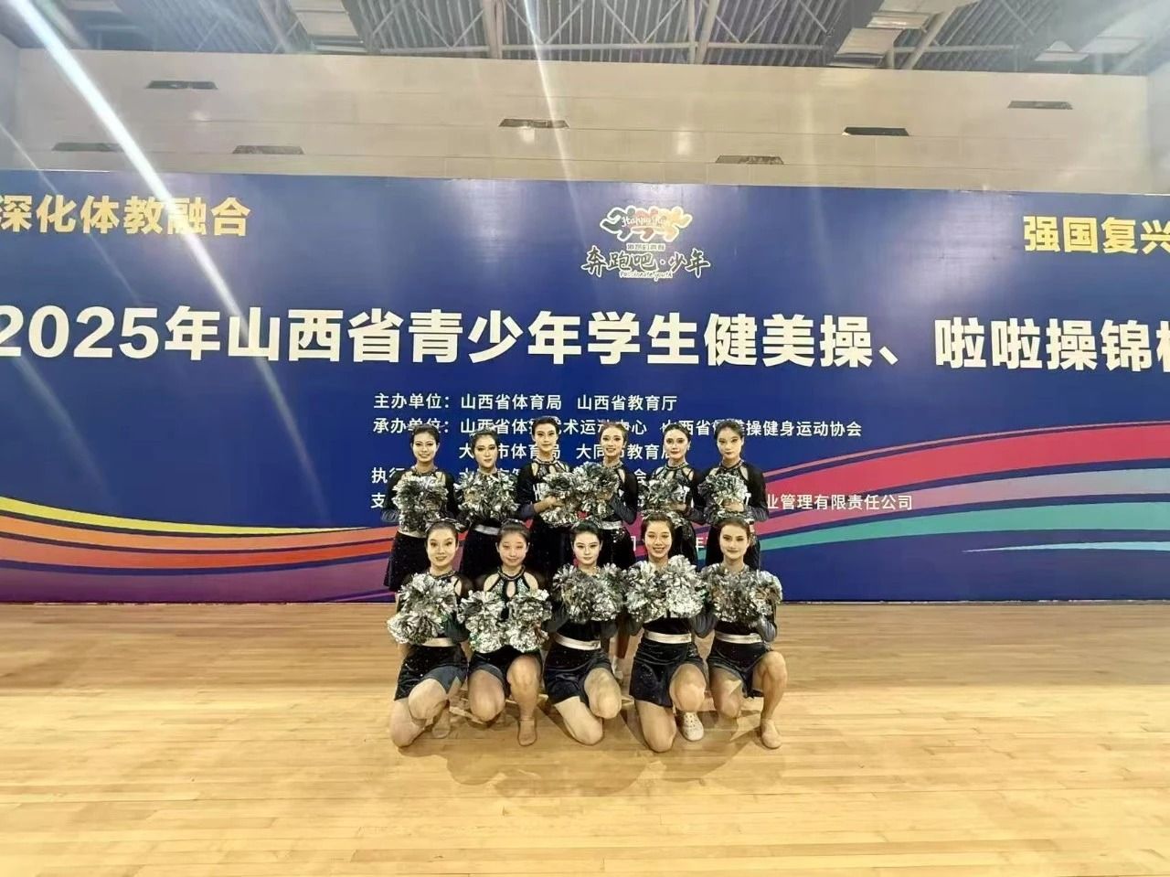 2025年7月15日至18日,由山西省教育厅、山西省体育局主办,大同市体育局承办的2025年山西省青少年学生健美操、啦啦操锦标赛在大同市体育中心体育馆隆重举行。我校啦啦操代表队由刘明星院长领队,庞蓉、白洋两位教练员悉心指导,18名运动员斗志昂扬出征赛场,最终勇夺2025版《全国啦啦操规定动作》花球超B(大学C组)桂冠,并在双人舞蹈啦啦操花球(大学C组)项目中斩获季军,同时荣获“优秀运动员”称号两项,尽显青春锋芒。