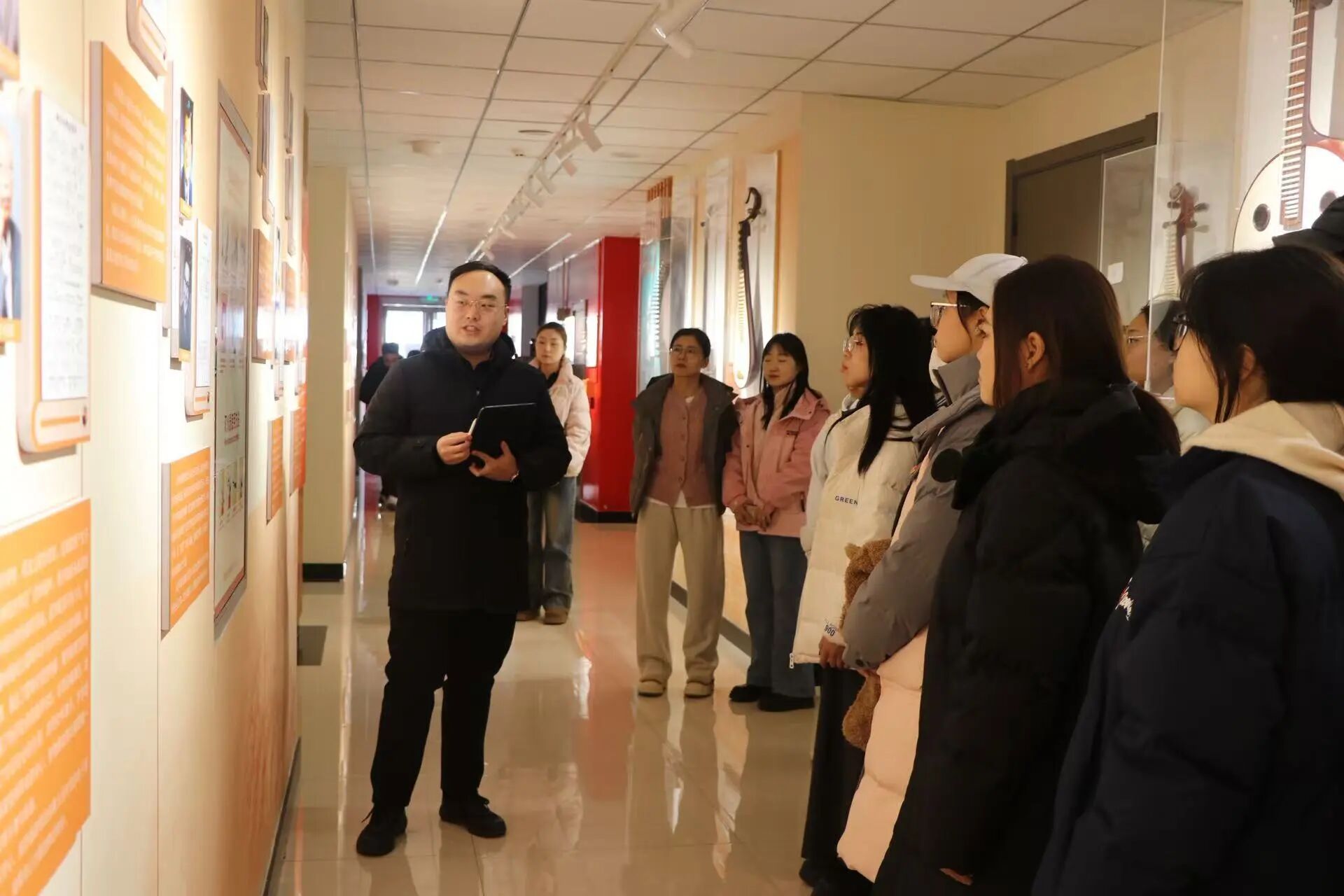 志愿者的细致讲解下,美术学院师生依次参观各篇章展区,深入了解《义勇军进行曲》《没有共产党就没有新中国》等经典曲目背后的创作背景与精神内涵,近距离感受编钟、二胡、古筝等民族乐器及各少数民族文化的独特魅力,直观体会“以美育促德育,以艺术化人心”的育人理念。参观过程中,双方师生围绕音乐与美术的思政表达、艺术形式的跨界融合等话题展开热烈交流。