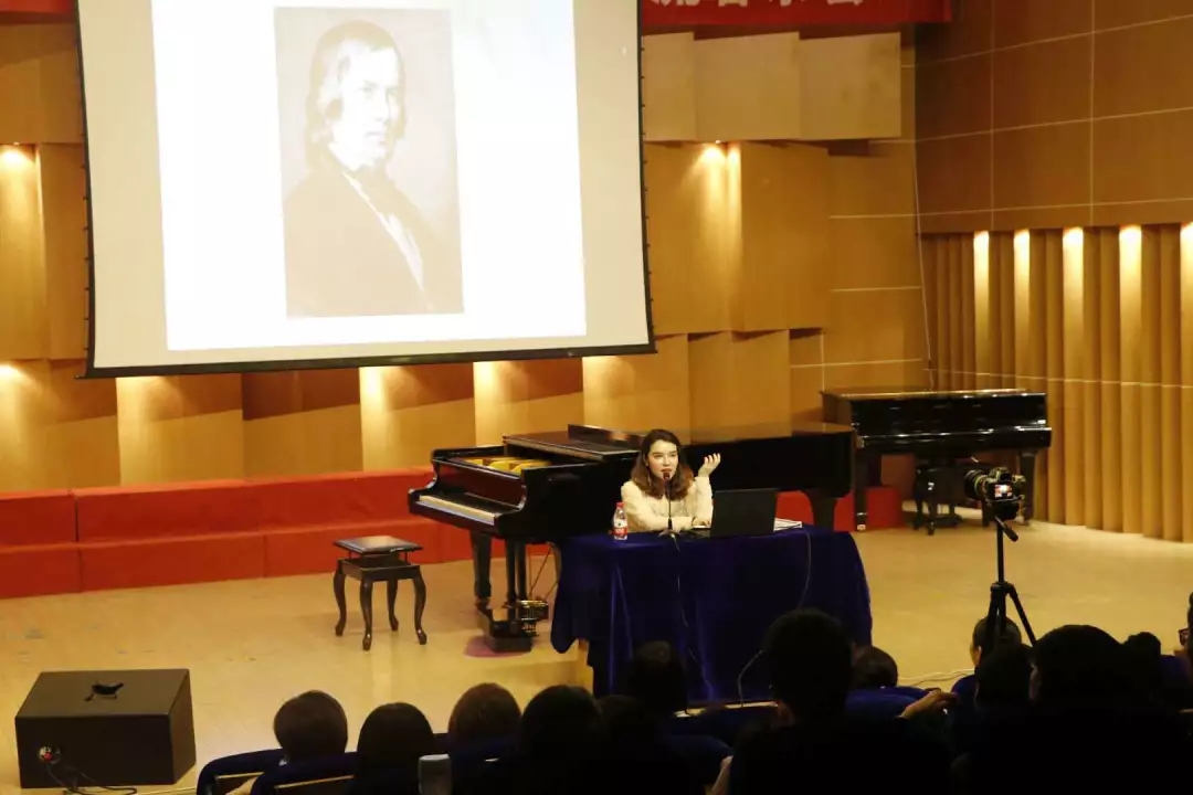 讲座上,谢怡晨老师说弹结合,幽默诙谐,就舒曼最具代表性的几首作品做了详细的介绍,用通俗的语言细致地向老师、同学进行讲解,使在座师生受益匪浅,对于舒曼的音乐风格中最基本、最重要的问题有了进一步认识。谢怡晨老师为了使同学们更好的理解舒曼风格,结合了舒曼生活中的种种事例进行说明。随后,谢怡晨老师带着同学赏析了舒曼的部分经典作品。讲座最后,谢怡晨老师讲到音乐的能量性和不可替代性。她提到,音乐作为一种情感表达和情感力量的艺术形式,有着巨大的美感能量。音乐教育的情感性和审美性是独特的,是其他艺术形式所不可替代的。并提出学生们要自己体会音乐所带来的力量。