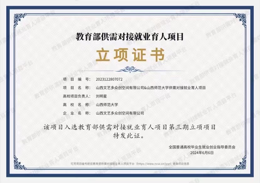 山西文艺多众创空间有限公司&走光视频 供需对接就业育人项目入选教育部供需对接就业育人项目第三期立项项目